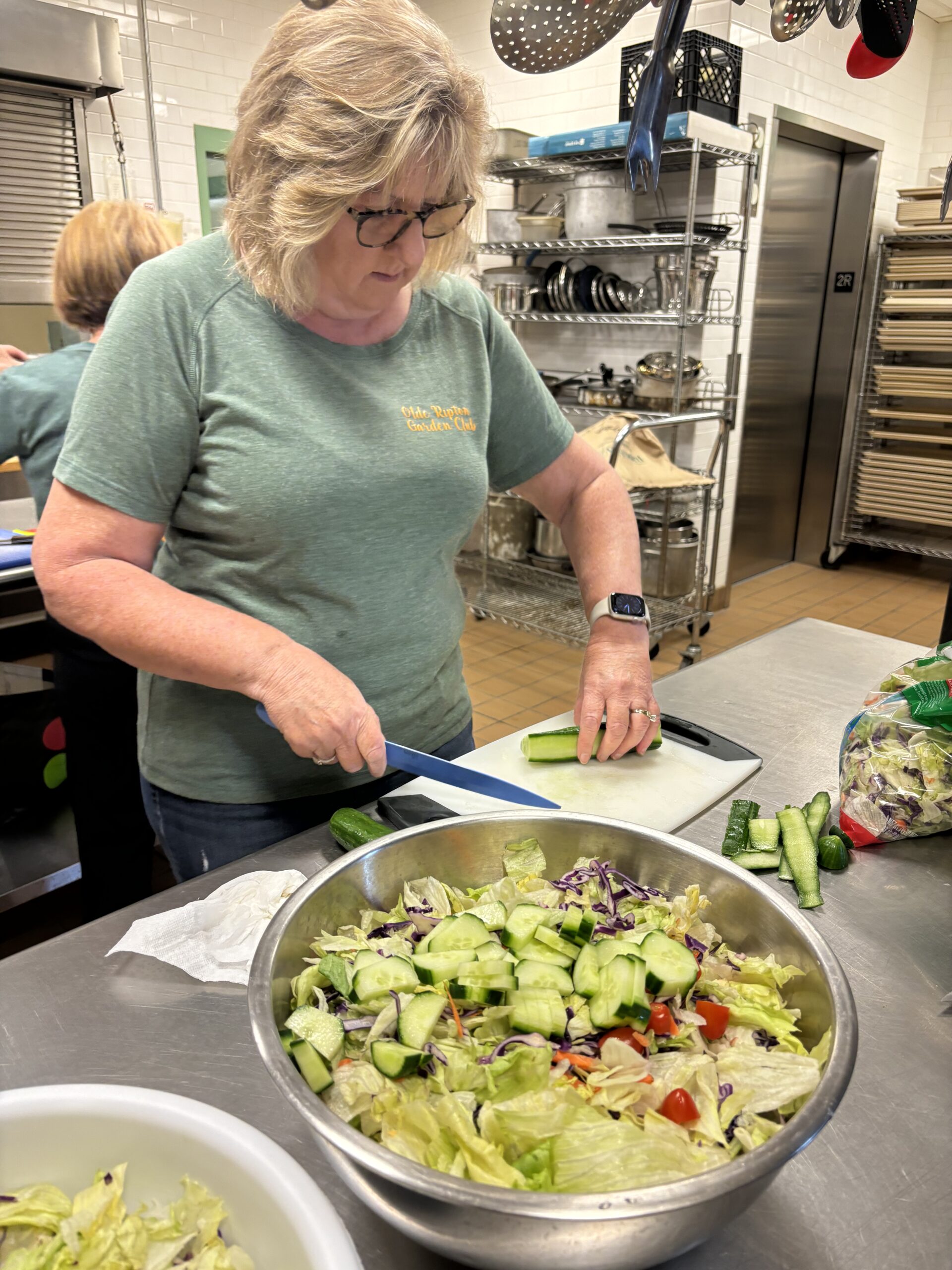 Joan Mauri chopping up the salad